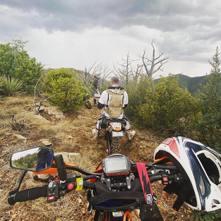 On the last week of July, eight friends and I traveled to a place I hold dear for hard enduro riding, the Bradshaw mountains of central Arizona. Known by the Yavapai Indians as Wi:kañacha, "rough, black range of rocks". Located just a short drive south of Prescott, the Bradshaws rise up from the desert floor that surrounds them to an elevation of over 7000’. Even in summer rideable conditions persist with temps at elevation 20° cooler than those in the nearby verde valley. Upon these mountains within the prescott national forest the decomposed granite and saguaros give way to high mountain pines and angular quarry stone. Tree fall is common among the tight, narrow brush leiden routes, perilous obstacles are a plenty. Heart pumping singletrack can be found throughout the range, much of it posted, numbered and mapped by the forest service. Faint lines through the forest and rock at times as these are not heavily trafficked due to their difficulty. Views from these tracks are breathtaking and stretch for miles, the atmosphere limiting visibility before the earth on the horizon does. Down low on the mountain dry creek beds of endless rock gardens stand guard to the ease of the two track just off in the distance, always seemingly just over the next ridge of pain and suffering, never quite within reach.